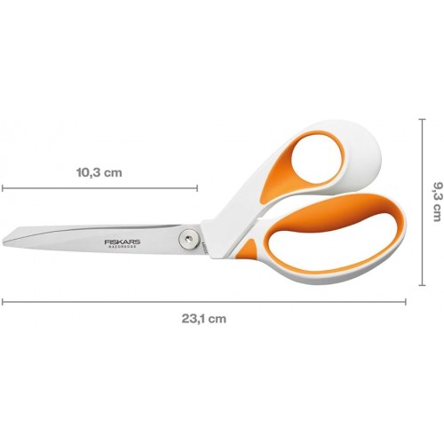 Ψαλίδι Fiskars RazorEdge™ 23cm είναι κατασκευασμένα για να κόβουν υφάσματα με μία απλή κίνηση. Οι εξαιρετικά κοφτερές λεπίδες από σουηδικό ατσάλι υψηλής ποιότητας με σκληρότητα HRC 57, χωρίς νικέλιο ιδανικό για χρήση σε όλα τα υφάσματα. Διαθέτει θήκη για την προστασία των λεπίδων όταν δεν χρησιμοποιούνται. Κατάλληλο για χρήση από δεξιόχειρες. Εργονομικές λαβές με σημεία επαφής Softgrip® για εξαιρετική άνεση.